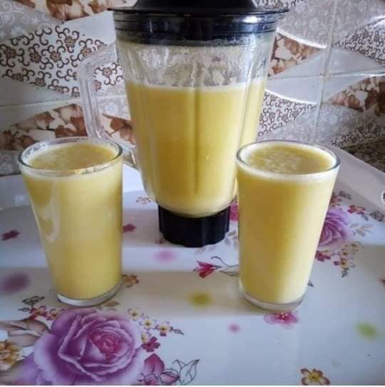 نقوم بوضع العناصر في الخلاط الكهربائي ونخلطهم جيدا قم نقوم بتقديم العصير بالصحة و الراحة