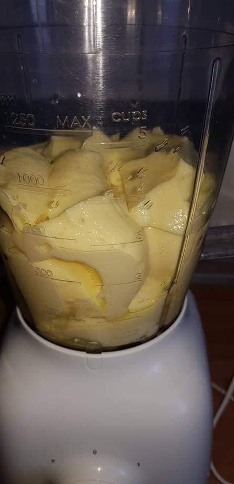 - ونعملو في الثلاجة حتى يعقد مزيان نعملوه في الخلاط الكهربائي ونزيد عليه عصير البرتقال ودانون ونطحنو مزيان وهاهوا واجد هاد