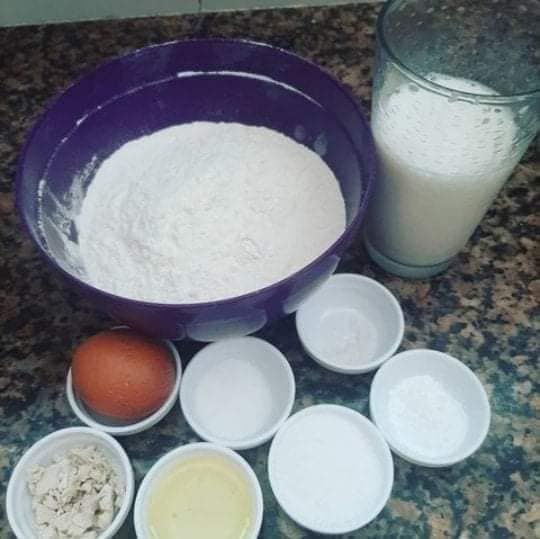 توضع جميع المكونات فإناء ونجمع بالحليب العجين يكون خفيف.