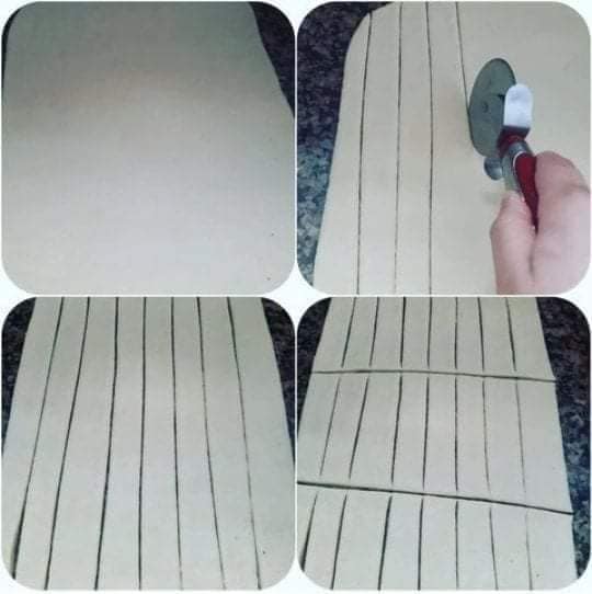 ونسرح العجين بالمدلك سمك العجين 3 مم تقريبا ونقطعو على شكل اشرطة
